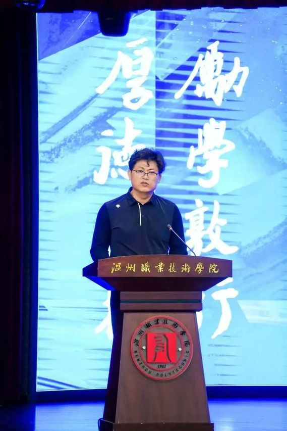 设计学院党总支书记欧阳翰夫作校友会筹备工作报告。他全面回顾了温州职业技术学院鞋行业校友会筹备历程,从团队组建细分职能、多渠道联络 173 名校友搭建信息库,到完善章程等制度保障规范运作,再到精心筹备成立仪式。同时,欧阳翰夫对校友会组织架构与发展规划进行阐释,明确将设立理事会等架构,重点发挥校友资源优势,在服务校友职业发展、推动产学研合作助力学院人才培养与学科建设、开展社会公益活动等方面发力,实现校友与母校双向赋能、共同发展。
