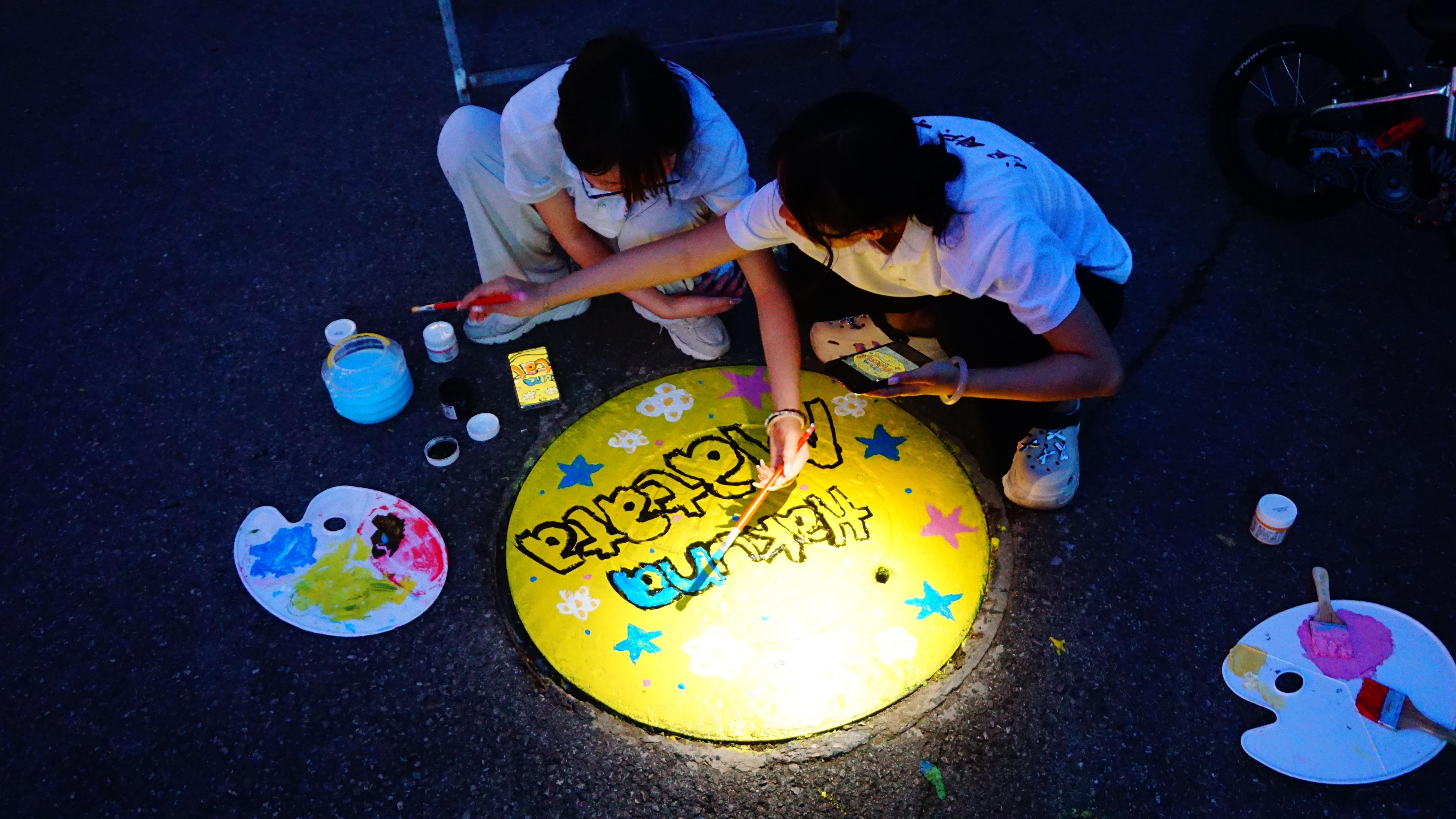 师生团队通过采访乡村CEO、村支书等,深入了解该村通过全域环境整治、生态景观建设与长效管护,实现从“挂牌村”到“美丽乡村”的华丽转身,成功跻身全国美丽休闲乡村推介名单的奋斗历程,进一步加深对“绿水青山就是金山银山”理念的理解。在夏志良的指导下,实践队成员带领村里的孩童拿起画笔,紧扣青山绿水主题绘制多彩井盖,将平凡井盖变为展现镬炉村风貌的“文化画布”,既美化了村容村貌,又赋予了乡村公共空间独特的文化内涵。
