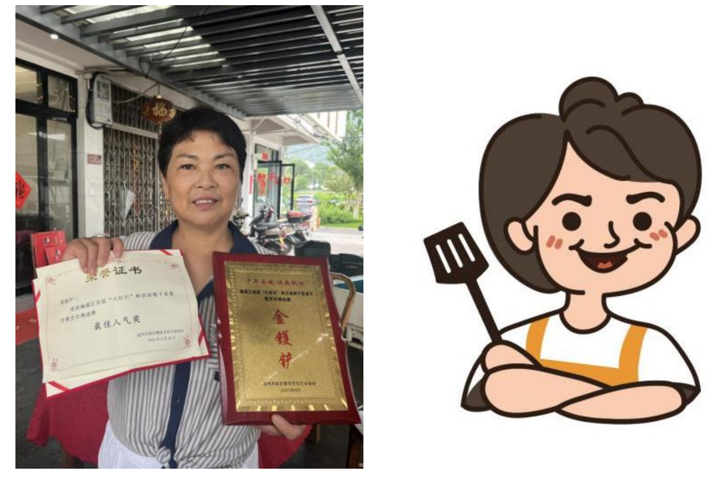 以镬炉村的非遗为底色,以沙岗粉干厂厂长黄阿姨为原型,团队设计创造了一个兼具其外观特征与精神内涵的卡通IP形象。该IP形象身着传统围裙,手持象征荣誉与传承的金镬铲,突破传统粉干品牌刻板印象,以年轻化的审美表达与主视觉系统设计,结合慢直播等形式,成功推动乡土文化从静态陈列转向动态传播,从小众圈层走向大众视野,实现文化生命力的当代延续。目前,IP形象广泛应用于符合市场需求的特色非遗产品及农产品,实现设计要素反哺乡村,形成“各美其美、美美与共”的产业文化融合生态,为乡村振兴与共同富裕提供了强劲动能。