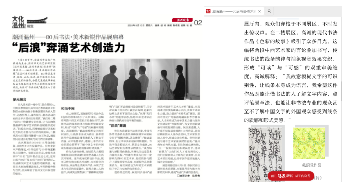 非遗文化传播与社会影响广。教师作品《枝韵流转》融合瓯绣技艺与现代艺术语言,亮相温州美术馆 “潮涌温州”邀请展,吸引超 3 万人次参观,被新华网、中国文化报等 180 余家媒体报道(图5),“非遗纹样的时空对话” 专题单日转发量破 10 万 +,登上微博热搜前三。展览期间举办的 “非遗与城市更新” 学术论坛,吸引全国 30 余所高校学者参与,相关成果被《温州晚报》专题刊载,形成“非遗活化—文化传播—学术研讨”的生态闭环。