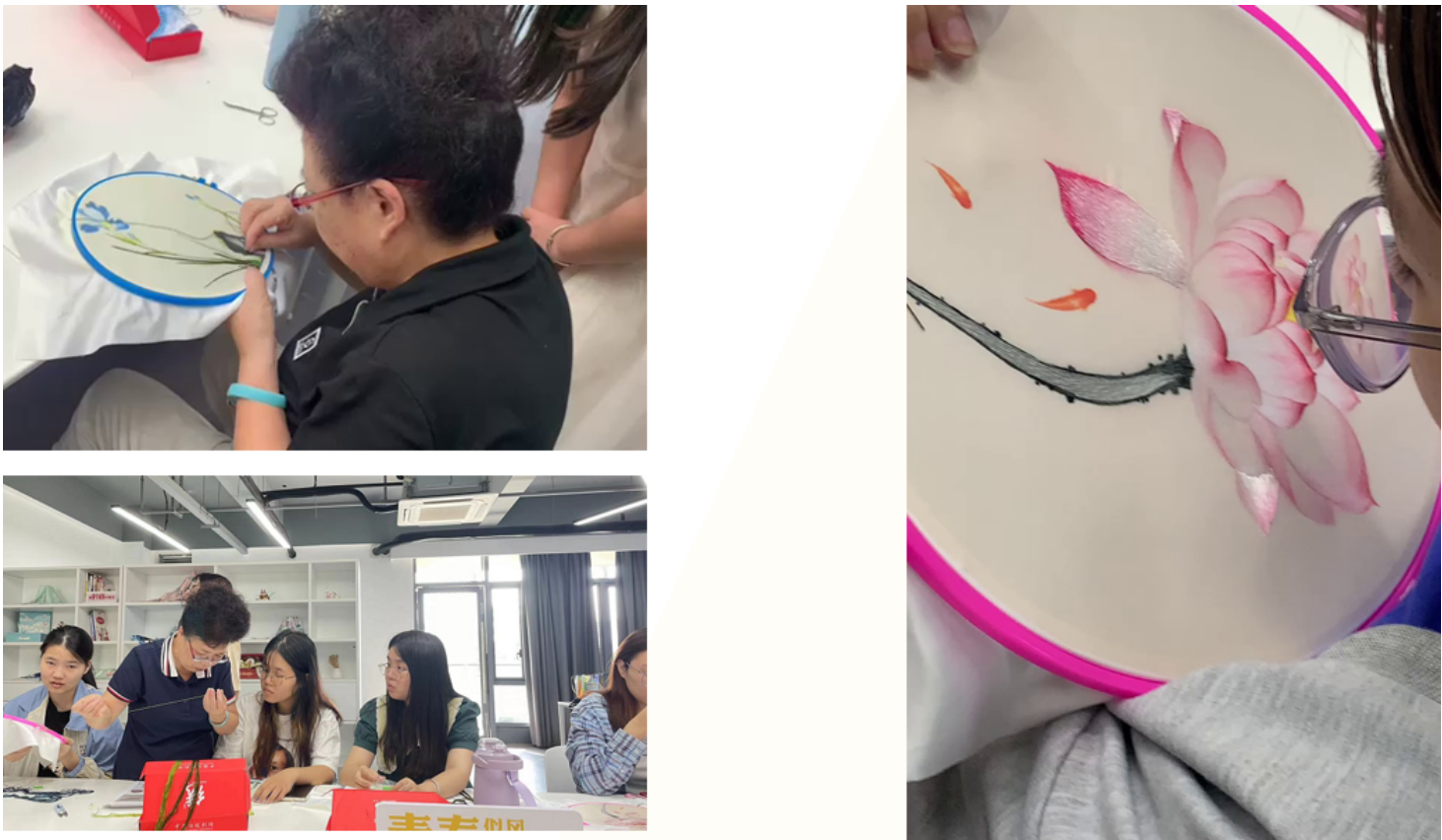 “专业导师 + 企业导师 + 非遗大师” 驻校授课,传授算法精髓,巧妙运用算法精准提取非遗元素,指导学生运用算法精准提取鱼灯鳞片纹、水波纹等非遗视觉符号,实现传统纹样与现代服饰版型的智能匹配,筑牢数字根基。非遗瓯绣大师季春英驻校(图3),肩负起传承技艺的重任,在非遗艺术维度上深挖文化富矿,于雕琢、编织、绘染间,让学生汲取千年智慧。
