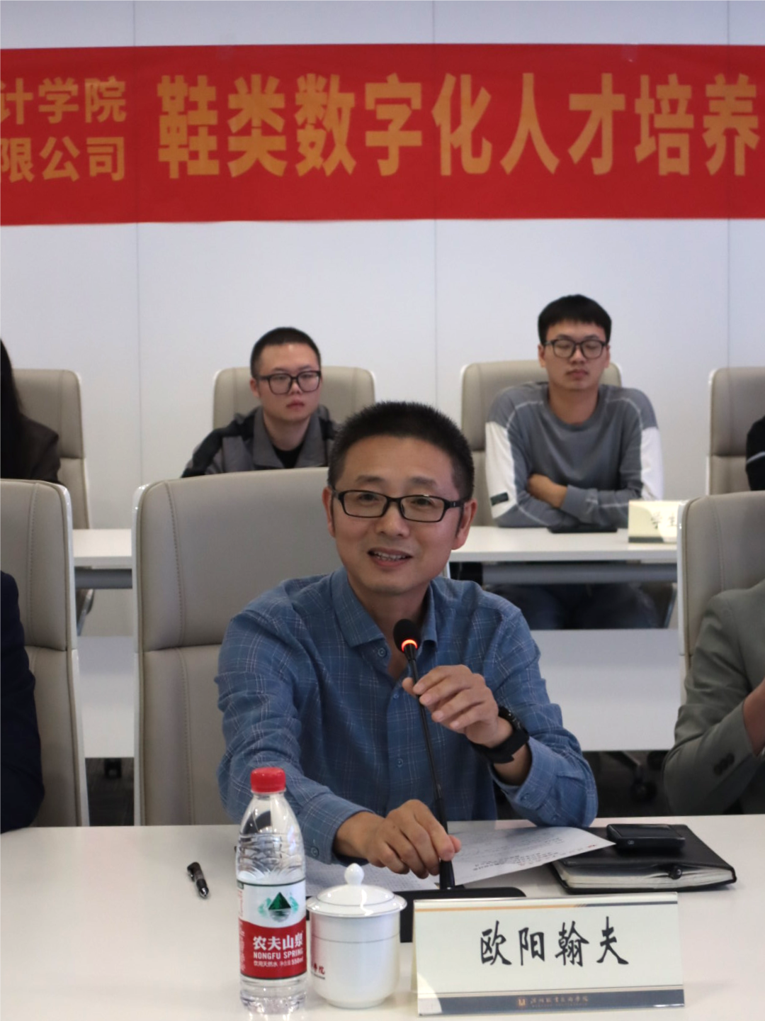 首先,欧阳翰夫致欢迎词。他代表设计学院对参会人员表示热烈欢迎,并简要介绍了学院的基本情况、办学特色以及在鞋类设计教育方面的专业优势,并强调学院对产教融合工作的重视。