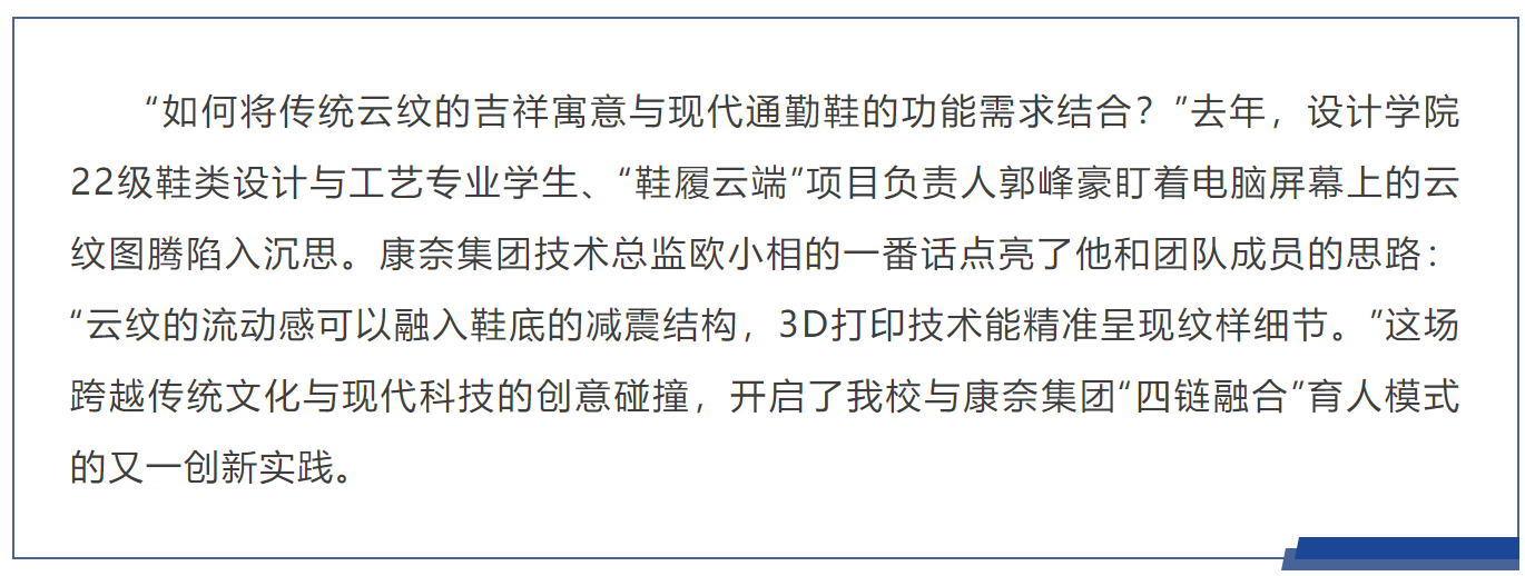 近年来,设计学院鞋类设计与工艺专业和康奈集团不断深化校企协同育人,双方以“需求导向、资源整合、协同创新”为核心,构建“教育链、人才链、产业链、创新链”深度融合的产教共同体,在人才培养、技术研发、产业升级等领域取得显著成效,为鞋履行业校企合作树立典范。
