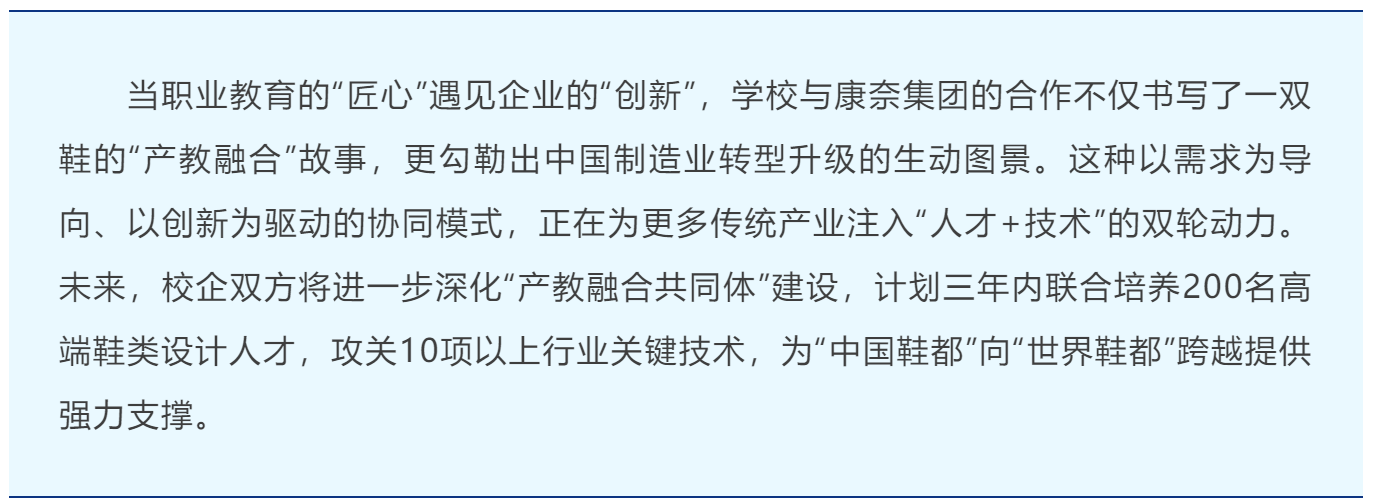 学校与康奈集团的深度合作,是职业教育产教融合“实践育人、资源共享、细分突破”三大关键路径的成功探索与实践。实践育人,以企业真实场景为课堂延伸,通过“学中做、做中学”培养创新能力;资源共享,打破院校与企业的资源壁垒,实现设备、数据、人才的双向流动;细分突破,聚焦足踝健康等产业前沿领域,通过跨学科协同实现技术标准引领。
