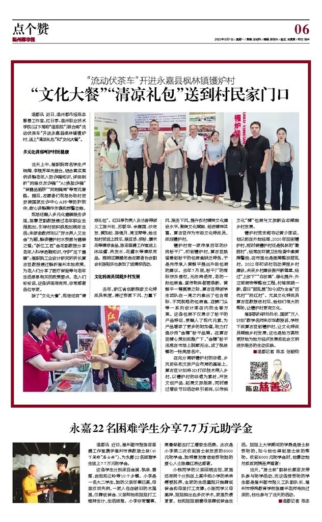 温都讯 近日,温州都市报陈忠慈善工作室、红日亭、温州职业技术学院(以下简称“温职院”)联合将“流动伏茶车”开进永嘉县枫林镇镬炉村,送上“清凉礼包”和“文化大餐”。