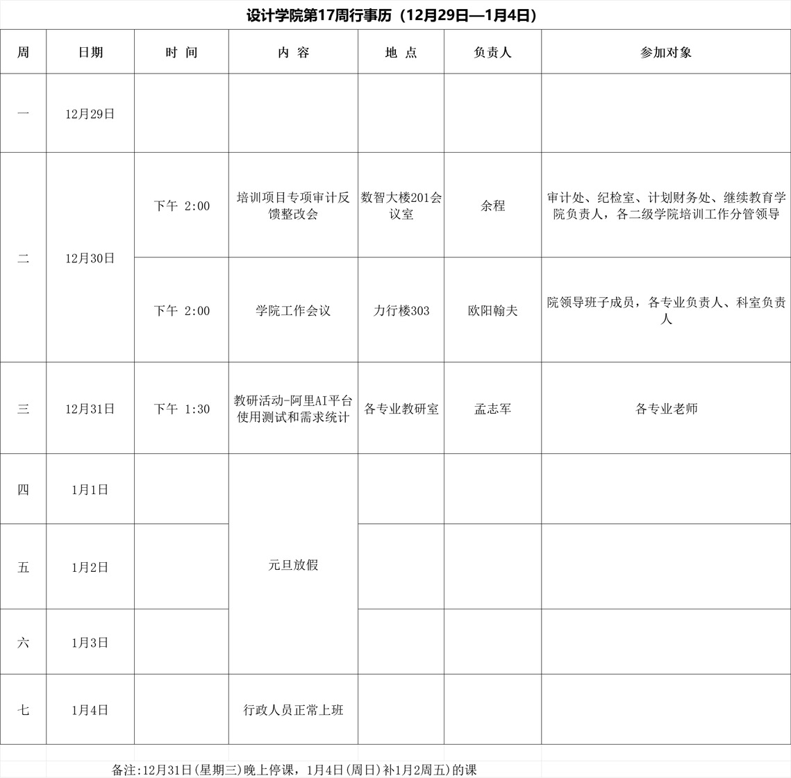 学院第17周行事历(12月29日—1月4日)
