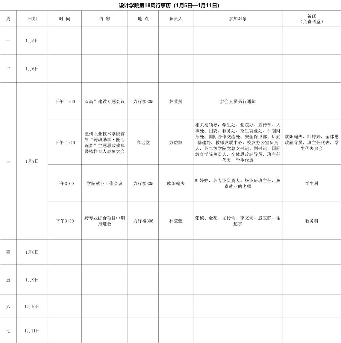 学院第18周行事历(1月5日一1月11日)