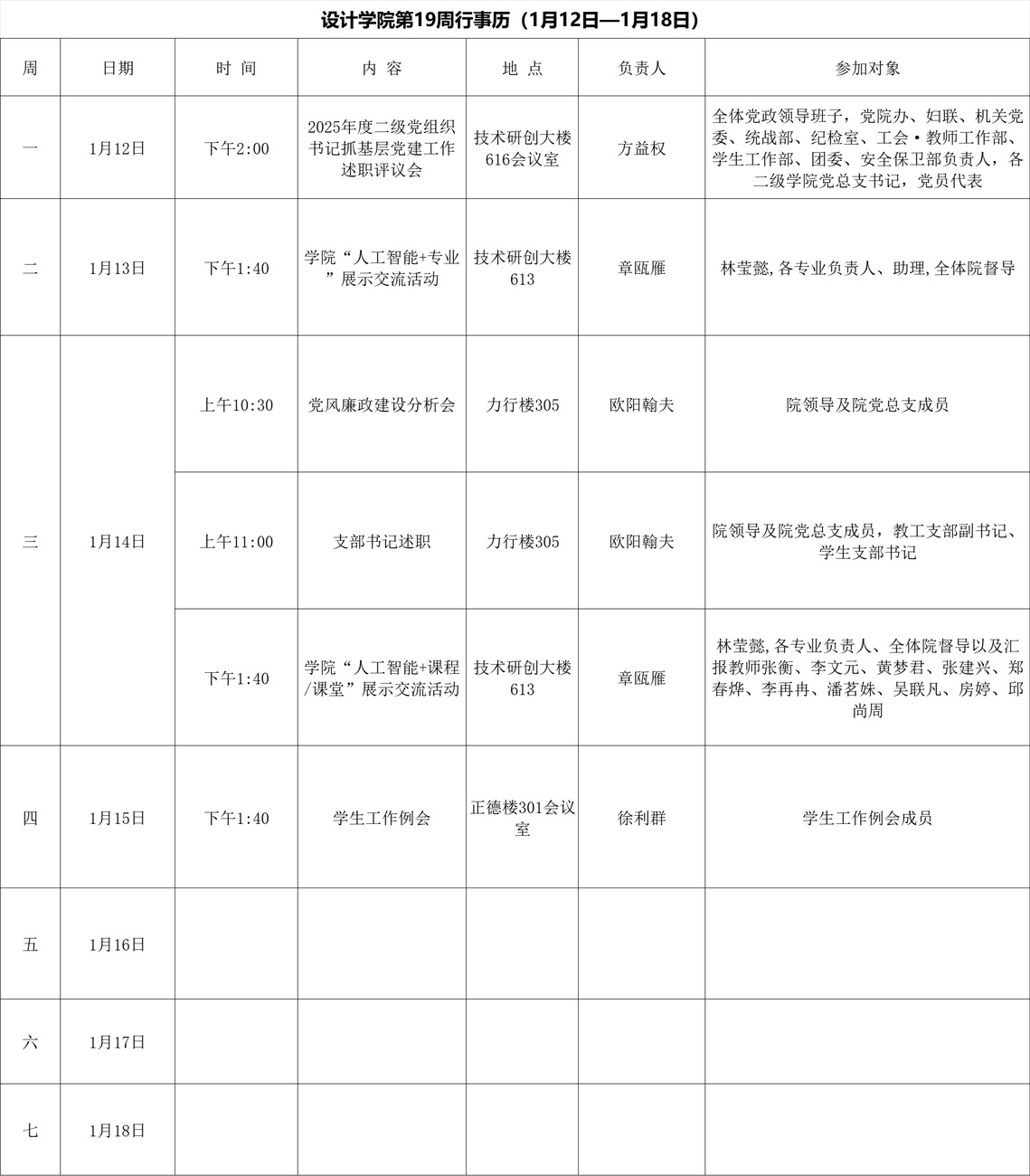 学院第19周行事历(1月12日—1月18日)