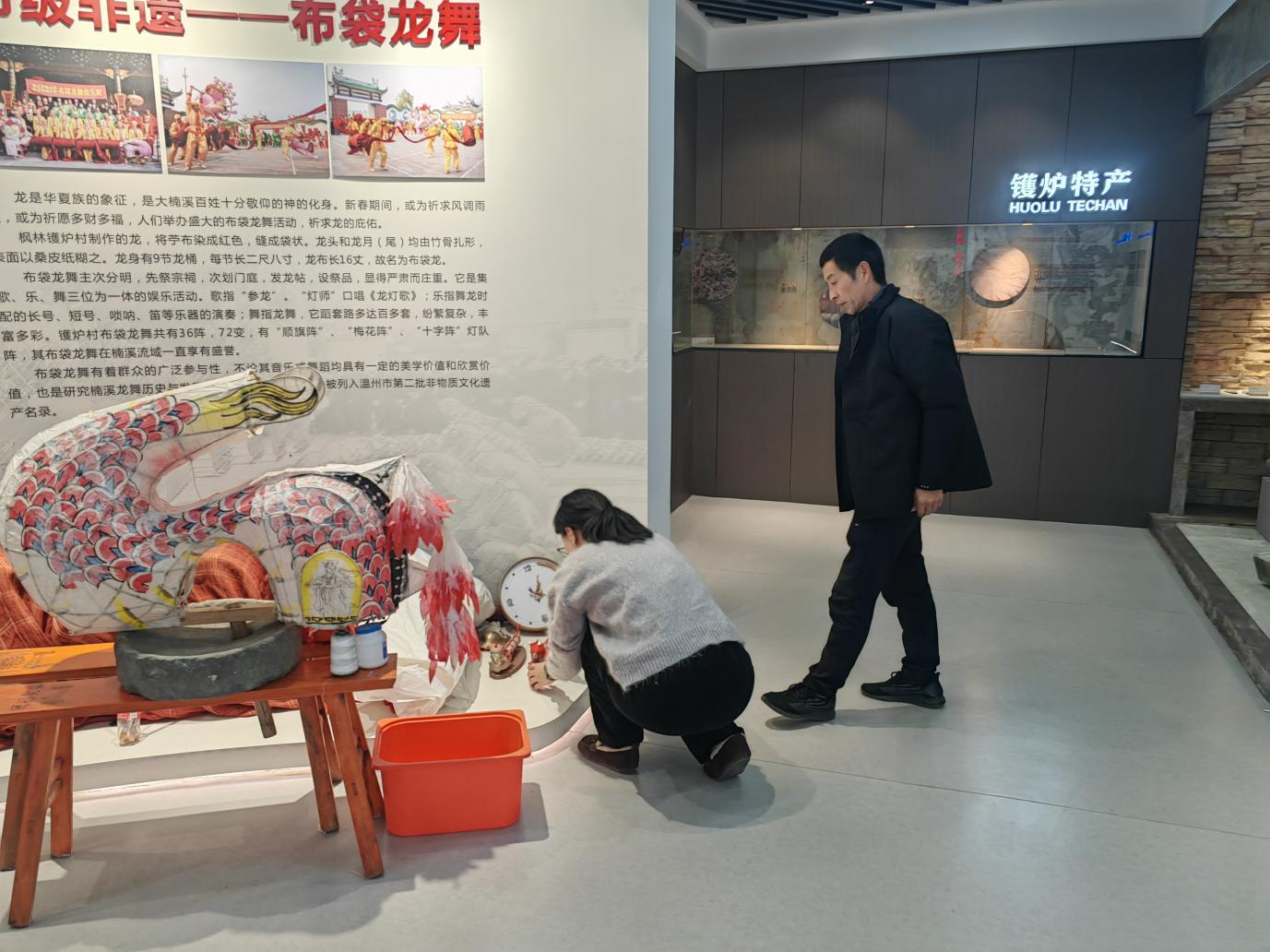 镬炉村村委会展厅原本主要用于村务公示和会议,空间利用率不高。经过温职院设计团队与村委会协商,展厅一角被改造为“乡村文创展示区”。首批展出的4件“布袋龙”作品包括挂钟、摆件、实用布袋等多个品类,吸引了众多村民前来参观。